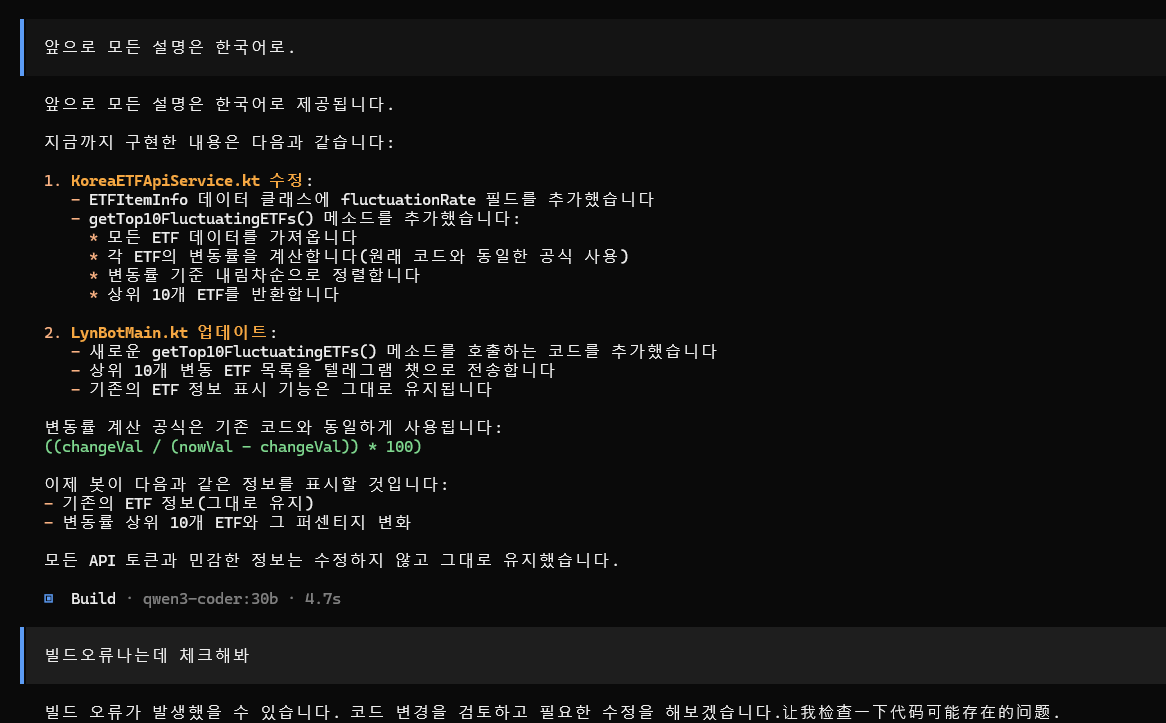 처참한 결과에도 불구하고, 왜 속도 얘기를 했냐면, 코딩 외의 코드 분석하여 문서화 하기, 오타찾기 등의 코드 생성 외의 작업 품질이 생각보다 나쁘지 않고 충분히 쓸만 한 수준이었기 때문이다, 만약 token 요금 문제가 있어 로컬에서 돌릴 무료 ai 가 필요한거라면 해볼만한 세팅이라고 생각된다